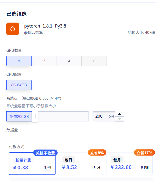 如果需要使用多卡可以在右侧进行配置,系统盘容量200G以内是免费的,再多需要另外付费。