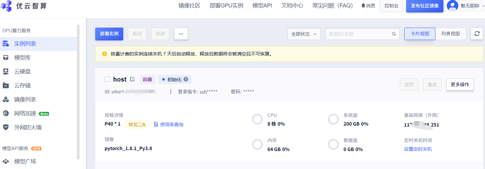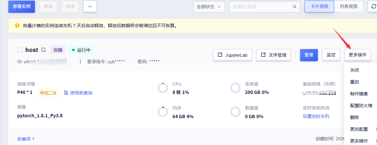 在更多操作里面可以进行关机、重启等操作,如果对当前GPU不满意也可以在更改配置中进行修改,按量计费模式下关闭后系统将停止计费。