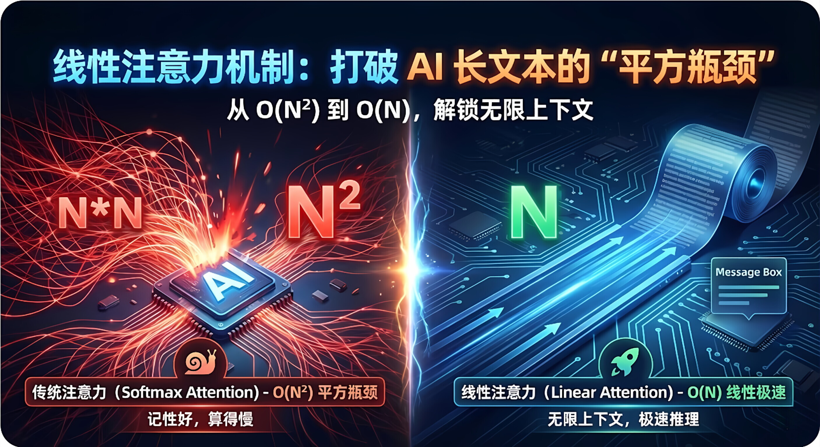 它的核心目标是:把大模型处理长文本的时间复杂度,从“平方级爆炸” (O(N^2)) 降低到“线性增长” (O(N))。