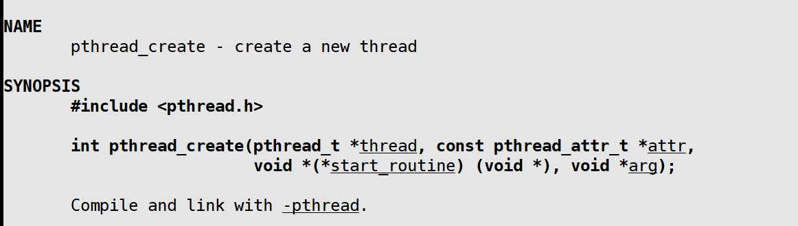 原型: int pthread_create(pthread_t *thread, const pthread_attr_t *attr, void * (*start_routine)(void*), void *arg);