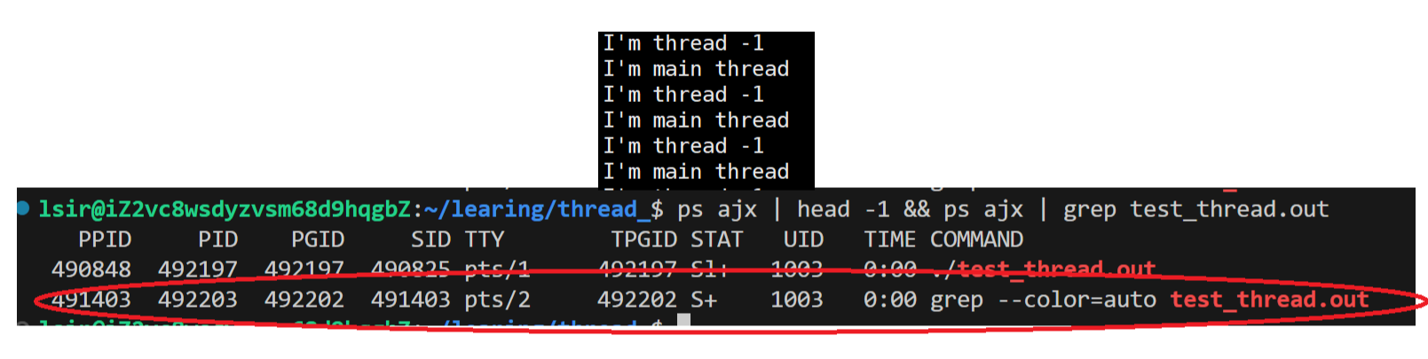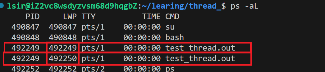 再次运行上次的进程后输入该指令就可以看到目标进程下出现了两个LWP不同的线程。