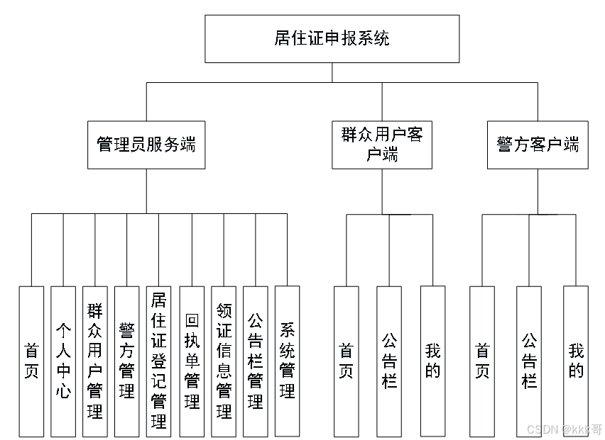 基于居住证申报系统的设计基于安卓手机上运行,可以实现管理员服务端;首页、个人中心、群众用户管理、警方管理、居住证登记管理、回执单管理、领证信息管理、公告栏管理、系统管理等功能。同时也方便警方客户端;首页、公告栏、我的,群众用户客户端;首页、公告栏、我的等详细的了解及统计分析。根据系统功能需求建立的模块关系图如下图: