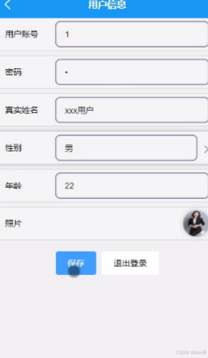 群众用户进入用户信息页面可以填写用户账号、真实姓名、性别、年龄、照片等信息,进行保存、退出登录操作,如图5-6-所示。