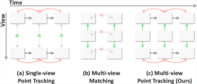 图 2: 动机。我们在概念上对比了我们的 (c) 多视角点跟踪与 (a) 单视角点跟踪 以及 (b) 多视角匹配。我们的方法同时建模视角内和帧间交互,以确保跨视角和时间一致性。
