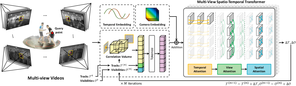 图 3: MV-TAP 的整体架构。给定同步的多视角视频,从 CNN 编码器特征中为每个查询点提取每视角相关体积。然后,将这些相关性进行标记化,并与相机嵌入(用于跨视角的相对几何上下文)和时间嵌入相加。轨迹和遮挡状态通过一个 Transformer 架构进行迭代更新,该架构包含时间、空间和视角注意力模块。
