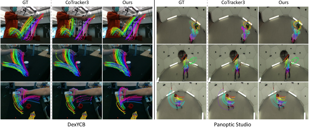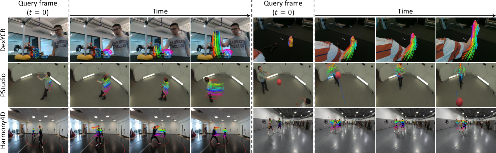 图 5: MV-TAP 在不同数据集上获得的点轨迹可视化。我们在 DexYCB [chao2021dexycb]、Panoptic Studio [joo2015panoptic] 和 Harmony4D [khirodkar2024harmony4d] 数据集上展示了我们模型的预测结果。