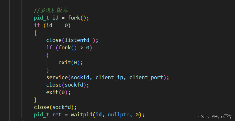 有很多人可能看不懂这段代码,现在我来进行解释以下,首先我们创建子进程之后,父进程必须关掉sockfd(也就是李四对应的文件描述符),这是因为随着客户端的访问人数增多,如果我们不关闭,就会导致文件描述符一直增多,并且我们将我们的任务交给子进程处理之后,父进程就不需要再继续占用这个文件描述符了,全权交给子进程就可以了,这样就可以缓解父进程文件描述符一直增多的问题。