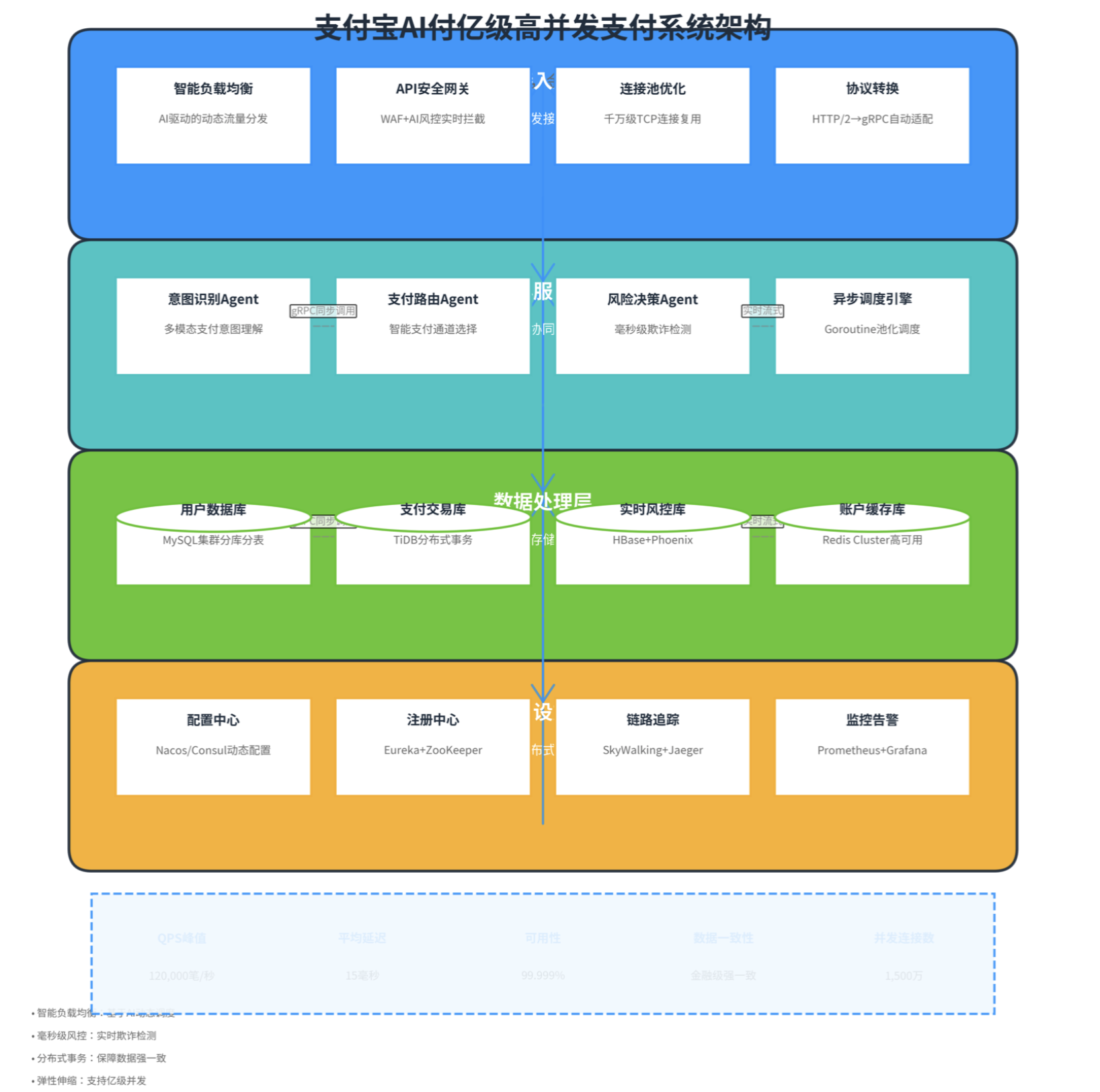- 亿级并发处理能力:单日峰值超过2000万笔,QPS需达12万笔/秒