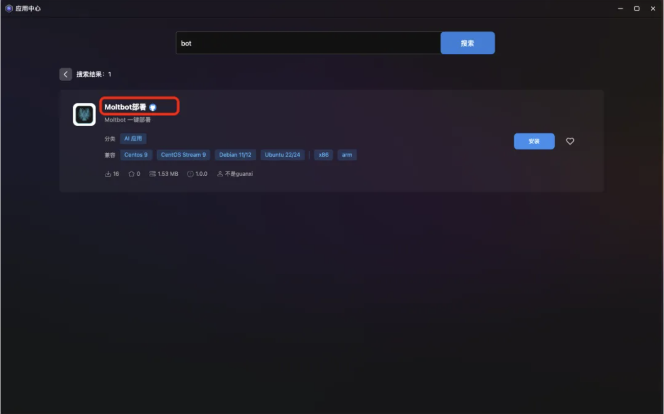 下载GMSSH客户端(或使用在线版)进入到GMSSH桌面,在应用中心搜索bot并安装,此处笔者使用的服务器 Ubuntu Server 22.04,2C4G的云服务器。经测试,此配置属于最低配置,若再低可能导致编译OOM内存溢出