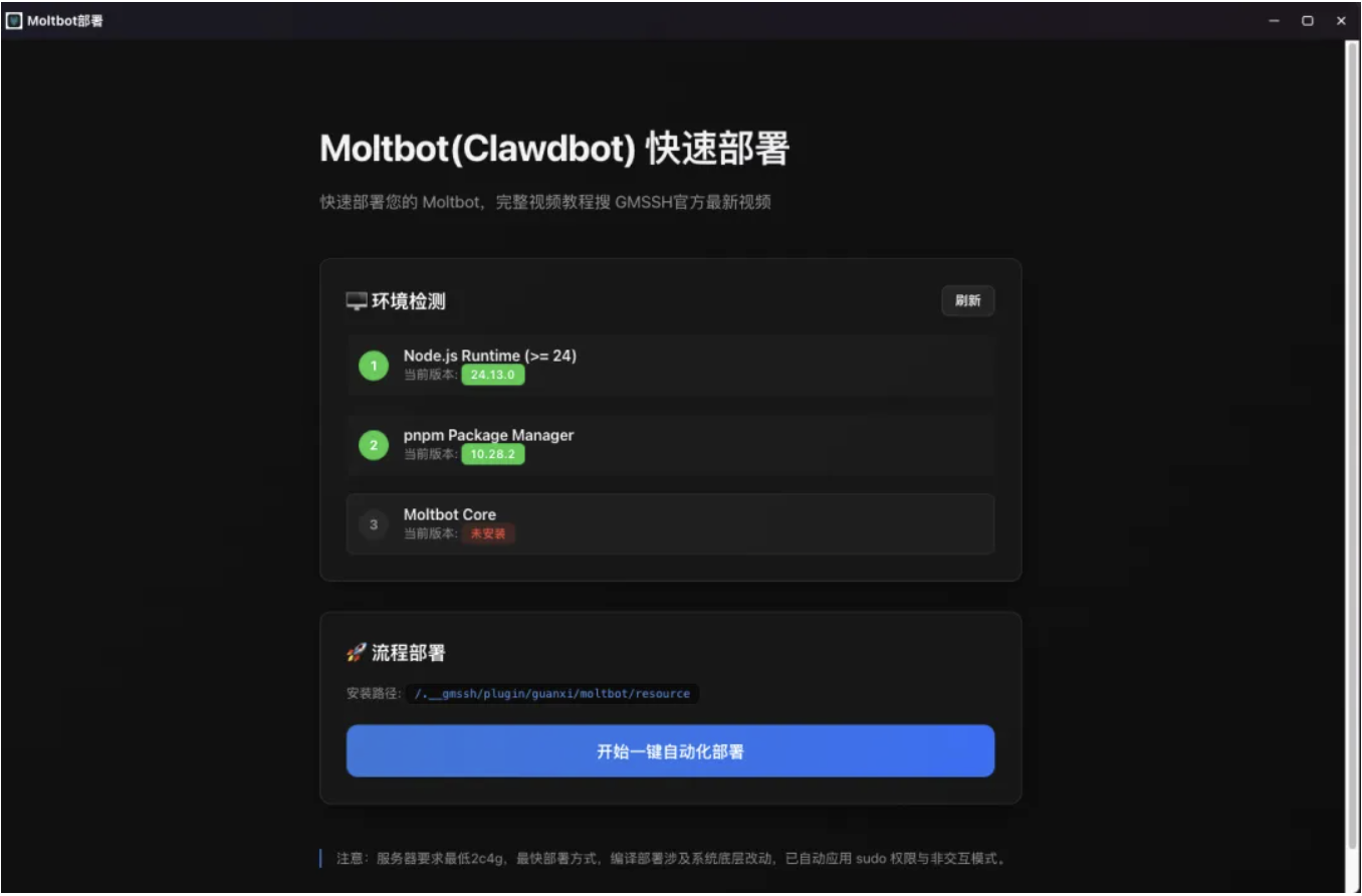 GMSSH 深知这些痛点。为了让每一位用户都能无门槛拥抱这款“最强 AI 助理”,我们连夜重构了底层逻辑,正式在应用中心上架 Moltbot 一键部署版。