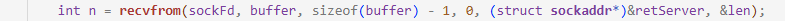 int n = recvfrom(_sockFd, buffer, sizeof(buffer) – 1, 0, (struct sockaddr*)&client, &sz);