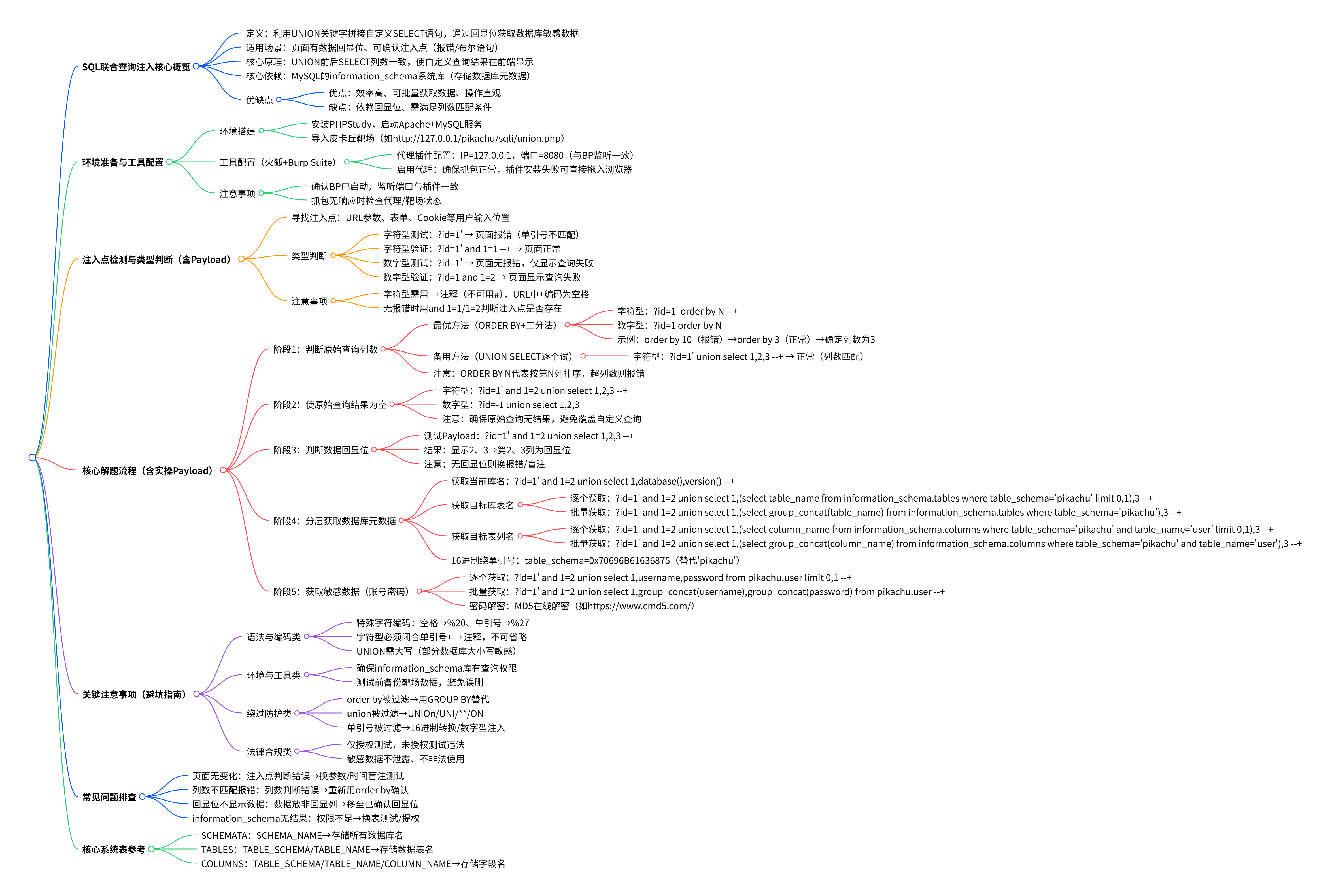 通过以上步骤,可完整实现联合查询注入,高效获取数据库敏感数据。关键在于严格遵循 “注入点检测→列数判断→回显位确认→分层获取数据” 的逻辑,同时注意语法闭合和绕过防护,避免踩坑。