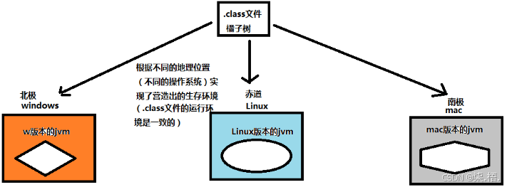 JVM:相当于“餐桌上的餐具”,食客(用户)通过餐具(JVM),才能享用美食(运行Java程序),不同的餐桌(操作系统),有对应的餐具(JVM版本),但用法完全一样。