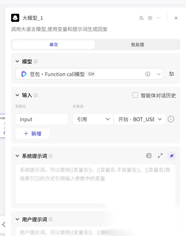 我们将开始节点指向大模型节点,选择一个大模型,再设置一下输入的参数名,输入由开始节点传入。并描述一下系统提升词