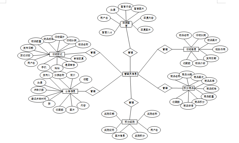 E-R图是由实体及其关系构成的图,通过E-R图可以清楚地描述系统涉及到的实体之间的相互关系。在系统中对一些主要的几个关键实体:将“积分奖励、公告信息、旧物回收、在线留言、旧物信息、积分商品”等作为实体,它们的局部E-R图,如图4-2所示: