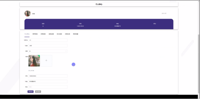 个人中心:在个人中心页面可以对个人中心、修改密码、旧物回收、回收进度、积分奖励、兑换记录、我的收藏进行详细操作;如图5-4所示: