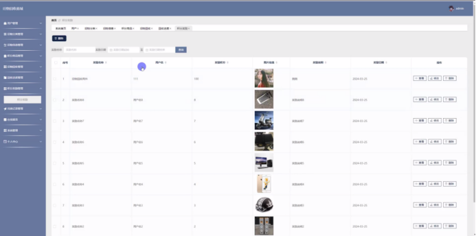 积分商品功能在视图层(view层)进行交互,比如点击“查询、添加或删除”按钮或填写积分商品信息表单。这些积分商品表单动作被视图层捕获并作为请求发送给相应的控制器层(controller层)。控制器接收到这些请求后,调用服务层(service层)以执行相关的业务逻辑,例如验证输入数据的有效性和与数据库的交互。服务层处理完这些逻辑后,进一步与数据访问对象层(DAO层)交互,后者负责具体的数据操作如查看、修改或删除积分商品信息,并将操作结果返回给控制器。最终,控制器根据这些结果更新视图层,以便积分商品功能可以看到最新的信息或相应的操作反馈。积分商品界面如图5-10所示: