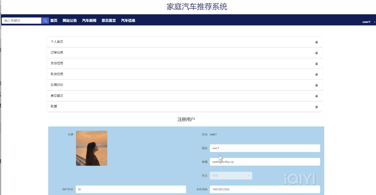 (3)个人中心:在前台点击“我的”下面的“个人中心”可以对个人首页、汽车信息、订单信息、发货信息、收货信息、反馈评价、意见留言、收藏等功能,点击即可进入详情进行编辑提交等操作。