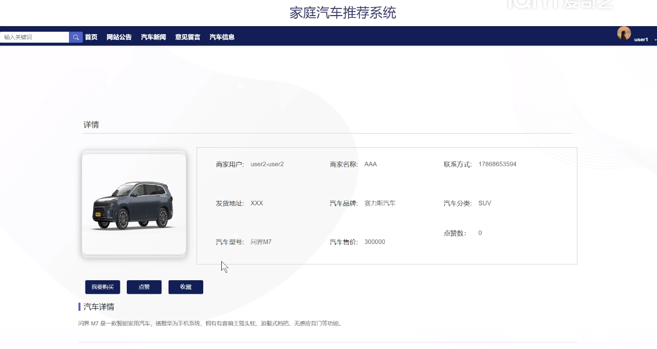 点击“汽车信息”这个菜单,可以查看到系统中所有添加的汽车信息,支持通过关键词进行查询,如果想要了解某一汽车信息的详细信息,点击后面的“详情”会进入详情查看界面,可以对汽车信息进行我要购买、收藏、评论等操作;界面如下图4-3所示。