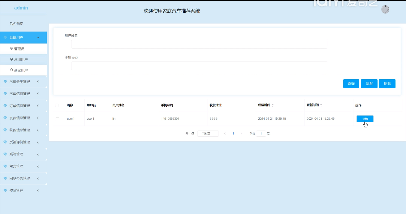 (3)汽车信息管理:点击“汽车信息管理”这个菜单,可以查看到汽车信息详情,进行查询,添加、删除等操作。