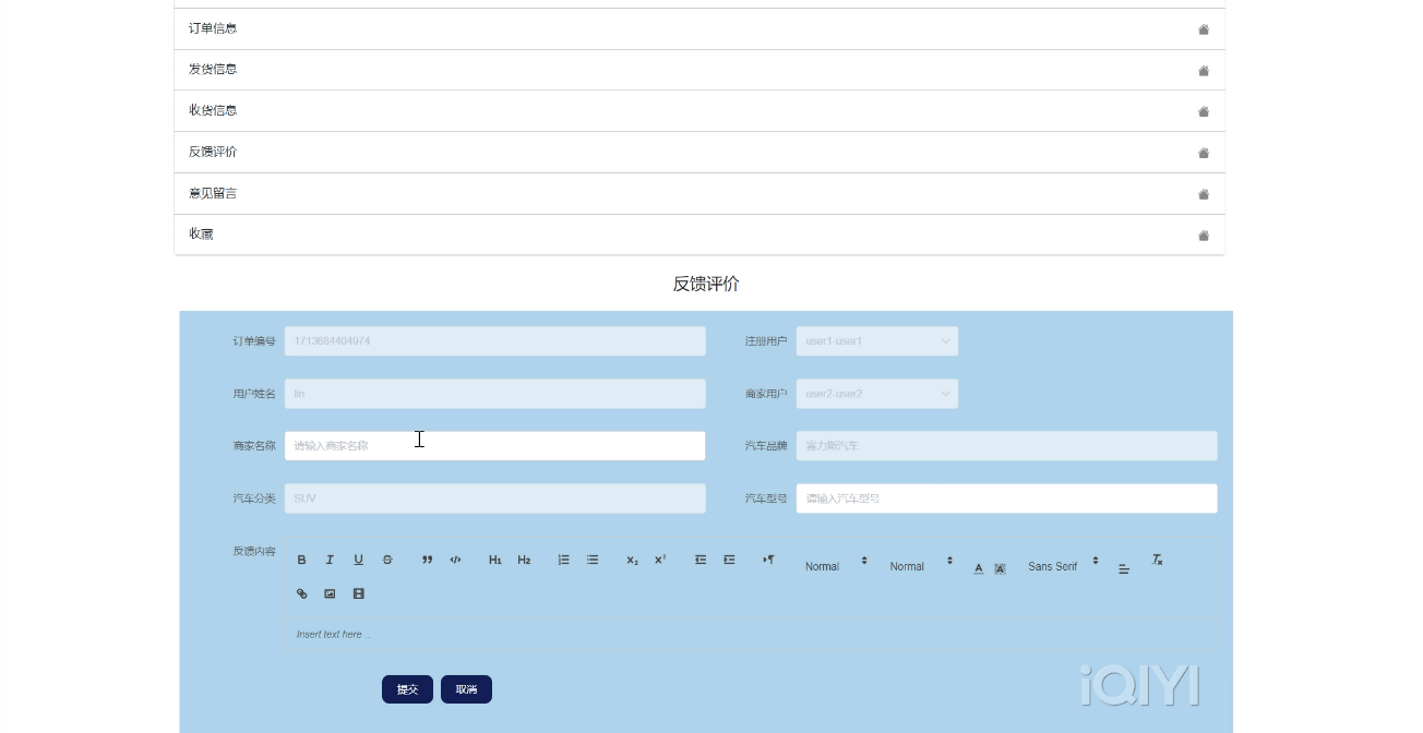 商家用户点击“反馈评价”按钮,可以查看到所以反馈评价信息详情,进行查询,添加、删除等操作等。界面如下图4-9所示。