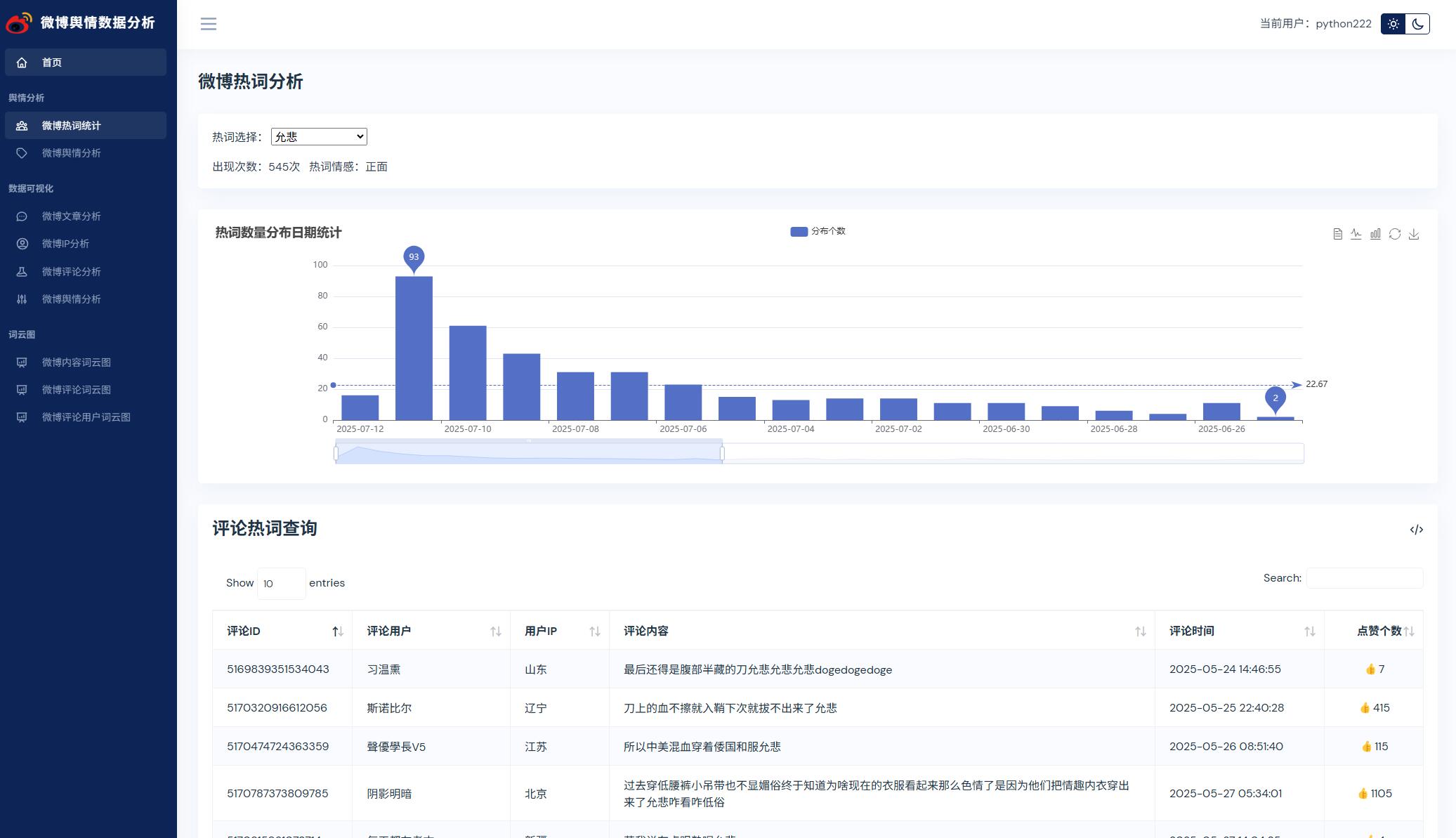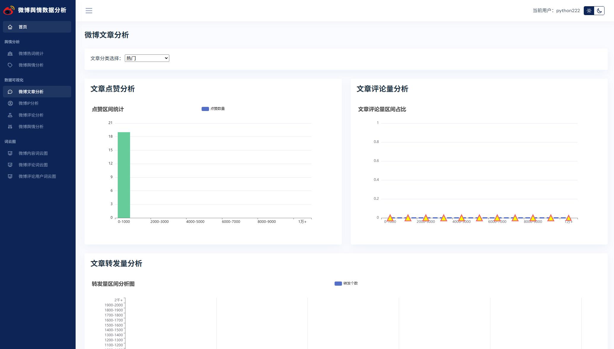 本文设计并实现了一个基于BERT大模型微调训练的微博舆情分析可视化系统。系统采用Python语言开发,后端使用Flask Web框架,前端使用ECharts进行数据可视化,数据库采用MySQL 8.0,深度学习框架采用PyTorch 2.x。系统主要包含以下功能模块:(1)微博数据爬虫模块,通过请求微博API接口自动采集微博文章和评论数据;(2)数据处理与分词模块,使用Pandas进行数据清洗,使用jieba进行中文分词和词频统计;(3)基于BERT大模型微调的情感分析模块,在BERT-base-chinese预训练模型的基础上,冻结BERT参数,添加全连接分类层,使用微博情感标注数据集进行增量微调训练,实现文本情感二分类(正面/负面);(4)数据可视化模块,使用ECharts实现折线图、饼状图、柱状图、词云图、中国地图等多维度可视化展示。