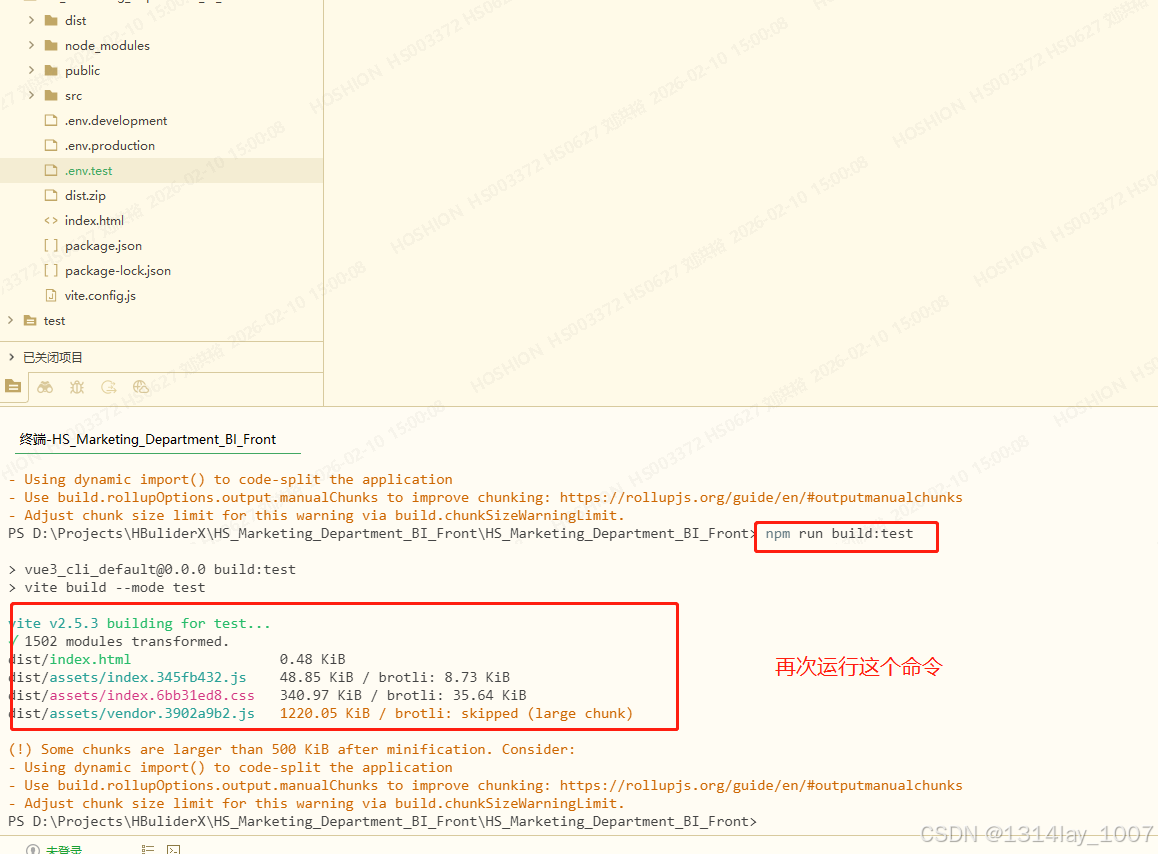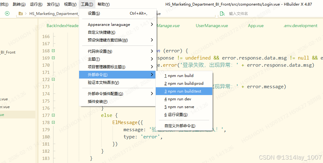 点击“工具”,点击“外部命令”,点击“npm run build:test“: