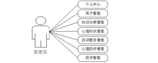学生心理咨询评估系统的最大权限用户是管理员,通过管理员菜单中的个人中心,用户管理,知识分类管理,心理知识管理,测评题目管理,心理测评管理,测评管理等选项来对系统后台信息进行管理。管理员用例如图3-7所示。