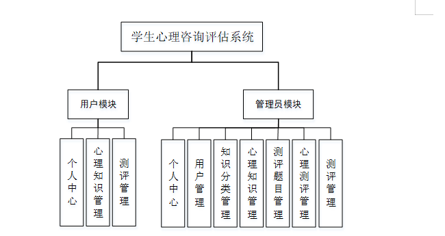 学生心理咨询评估系统的整体结构设计主要分为两大部分:管理员和用户。管理员的职责是管理用户信息及设置用户权限,发布公告等其他基础功能的管理;整体结构设计如图4-2所示。