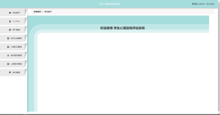 管理员进入主页面,主要功能包括对个人中心,用户管理,知识分类管理,心理知识管理,测评题目管理,心理测评管理,测评管理等进行操作。管理员主页面如图5-2所示: