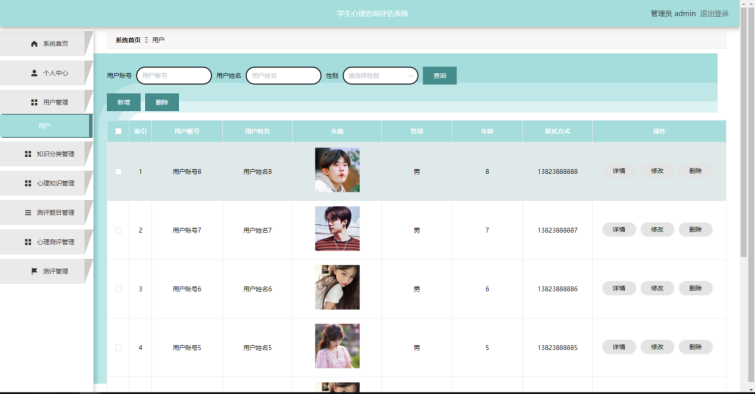 管理员点击心理测评管理。在心理测评管理页面输入心理测评名称和进行查询、新增或删除心理测评管理列表,并根据需要对心理测评管理详情信息进行详情、修改或删除操作;如图5-7所示: