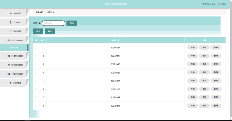 管理员点击知识分类管理。在知识分类页面输入知识分类进行查询、新增或删除知识分类列表,并根据需要对知识分类详情信息进行详情、修改或删除操作;如图5-4所示: