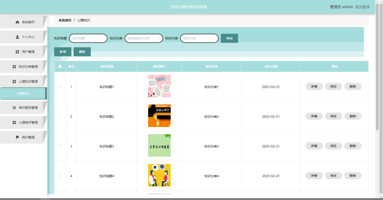 管理员点击心理知识管理。在心理知识页面输入知识标题,选择知识分类和知识内容进行查询、删除或新增心理知识列表,并根据需要对心理知识详情信息进行详情、修改或删除操作;如图5-5所示: