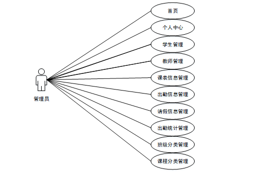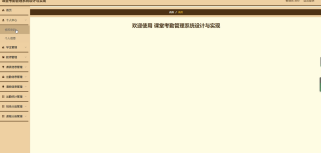 管理员登录系统后,可以对首页、个人中心、学生管理、教师管理、课表信息管理、出勤信息管理、请假信息管理、出勤统计管理、班级分类管理、课程分类管理等功能进行相应操作,如图5-2所示。