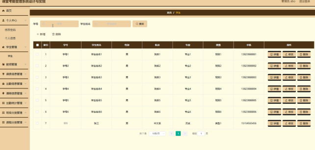学生管理,在学生管理页面可以对学号、学生姓名、性别、院系、专业、班级、手机等内容,进行详情、修改、删除等操作,如图5-3所示。
