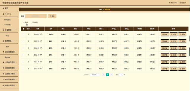 课表信息管理:允许管理员对课程表进行维护,包括课程名称、日期、星期、时段等信息。