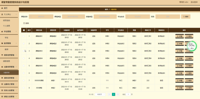出勤信息管理,在出勤信息管理页面可以对课程名称、课程类型、出勤时间、离开时间、缺勤类型、学号、学生姓名、班级、教师工号、教师姓名等内容进行详情、删除等操作,如图5-6所示。