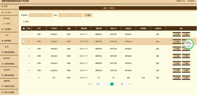 请假信息管理,在请假信息管理页面可以对学号、学生姓名、班级、请假日期、请假天数、教师工号、教师姓名、审核回复、审核状态等内容进行详情、删除等操作,如图5-7所示。
