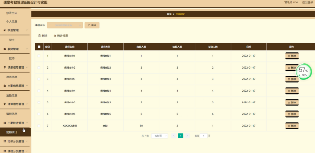 出勤统计管理,在出勤统计管理页面可以对课程名称、课程类型、出勤人数、请假人数、缺勤人数、日期等内容进行删除等操作,如图5-8所示。