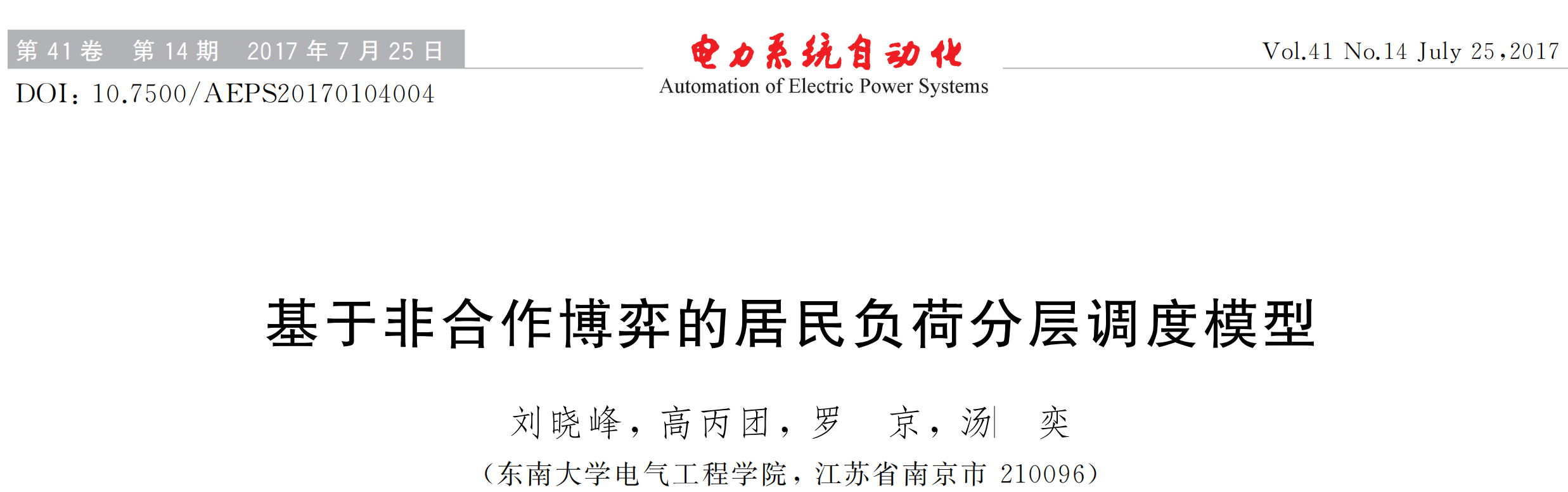 [1]刘晓峰,高丙团,罗京等.基于非合作博弈的居民负荷分层调度模型[J].电力系统自动化,2017,41(14):54-60.