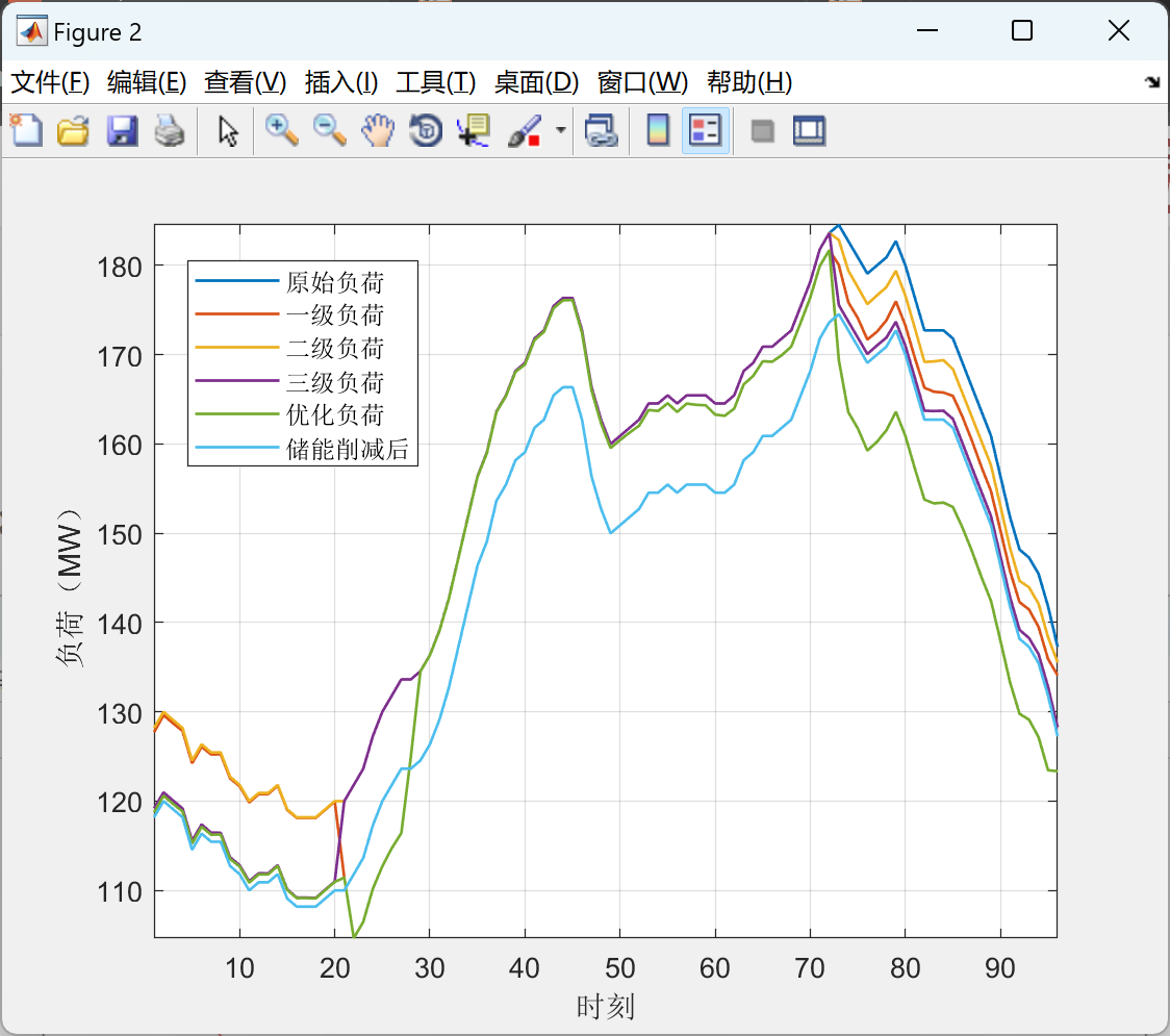 figure(2) plot(Pload','-','linewidth',1); hold on plot(Pload'+L1,'-','linewidth',1); hold on plot(Pload'+L2,'-','linewidth',1); hold on plot(Pload'+L3,'-','linewidth',1); hold on plot(Pload'+L3+L1+L2,'-','linewidth',1); hold on plot(Pload'+Pess,'-','linewidth',1); hold on % axis([1,96,0,200]); axis tight grid on xlabel('时刻'); ylabel('负荷(MW)'); legend('原始负荷','一级负荷','二级负荷','三级负荷','优化负荷','储能削减后');