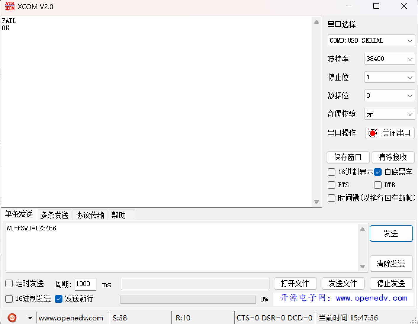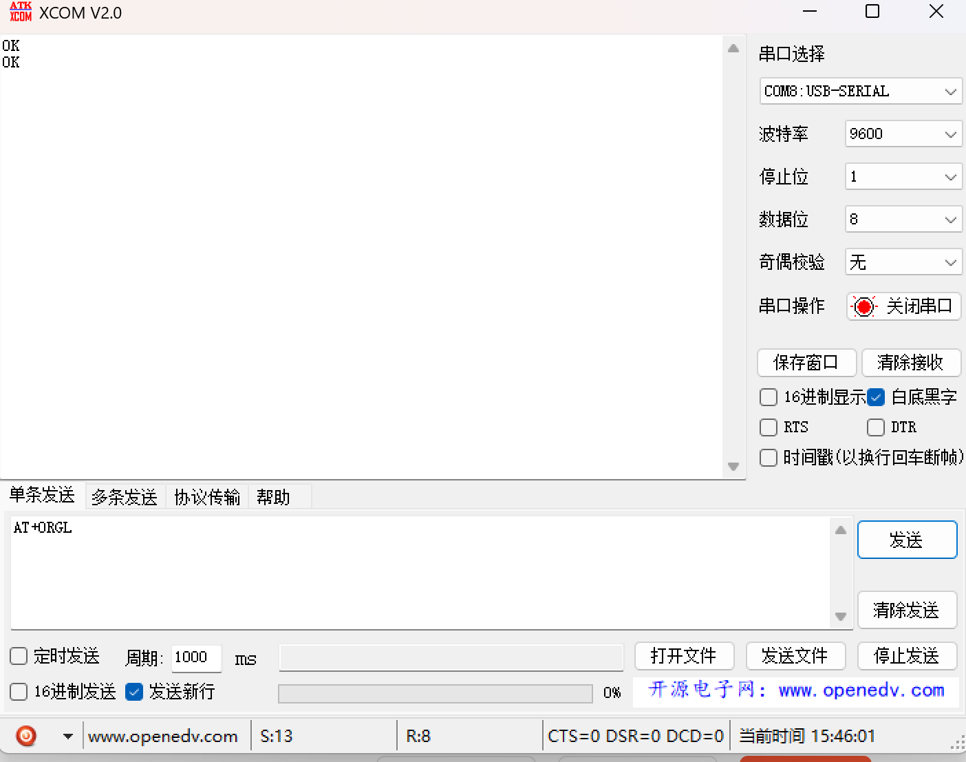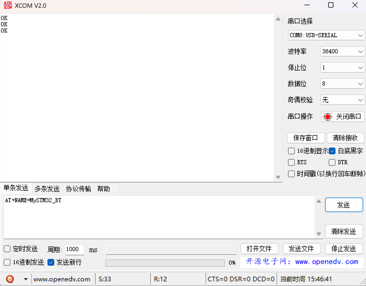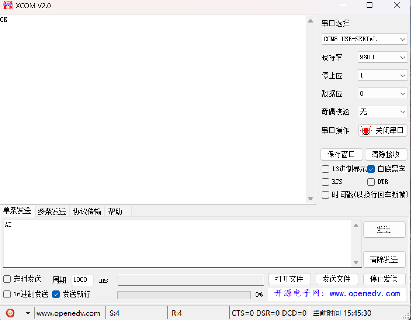 - 发送设置:勾选“发送新行”(发送\\r\\n),这点非常重要,否则模块无响应。
