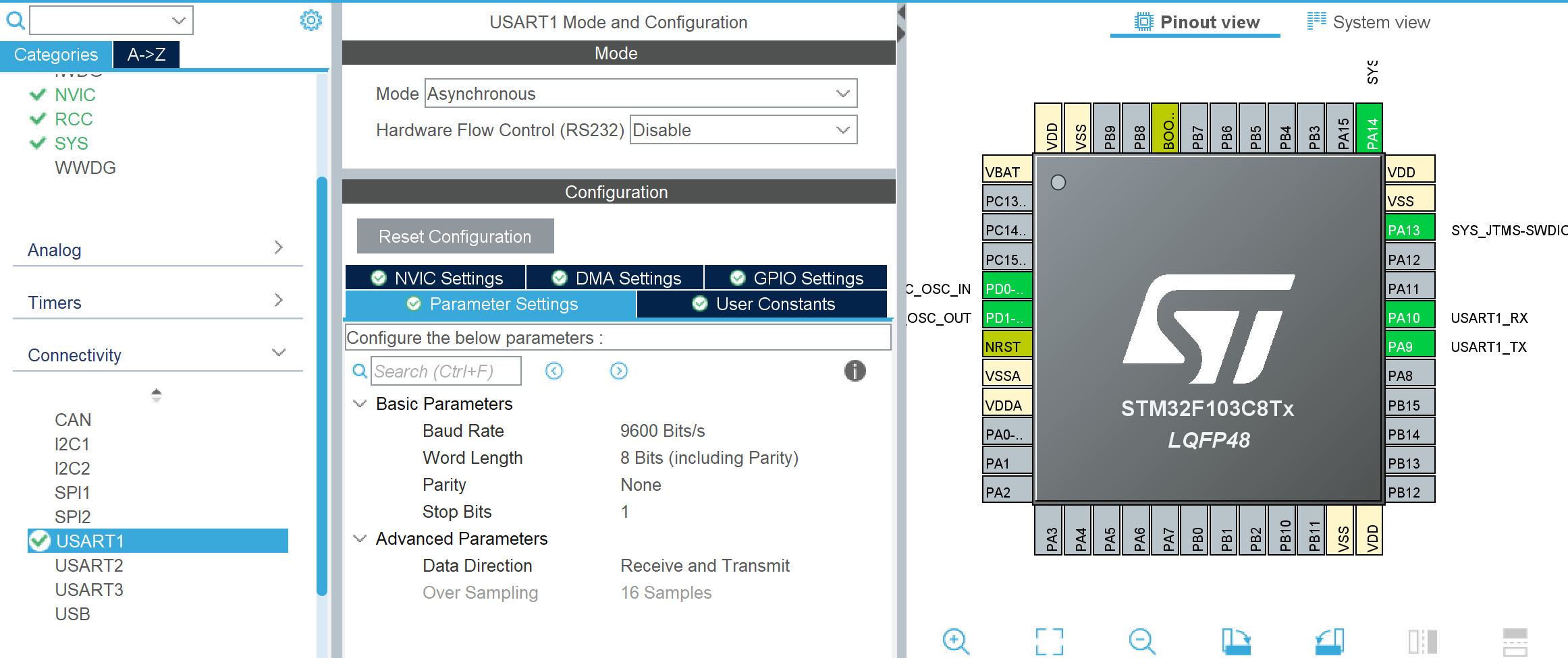 假设我们使用 STM32F103C8T6,我们将使用 USART1 连接蓝牙,PC13 控制板载LED。