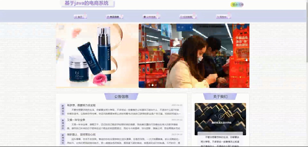 当人们打开系统的网址后,首先看到的就是首页界面。在这里,人们能够看到电商系统的导航条和公告信息等。系统首页界面如图5-1所示: