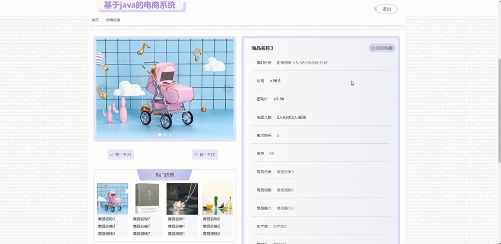 商品信息管理:发布和管理商品详细信息,包括商品名称、分类、图片、规格、简介、详情、生产地、原材料、品牌、上架日期、单次限购、库存、价格、团购价、拼团人数、当前人数等,支持点赞、踩、评论、收藏、添加到购物车、立即购买、我要开团等操作。