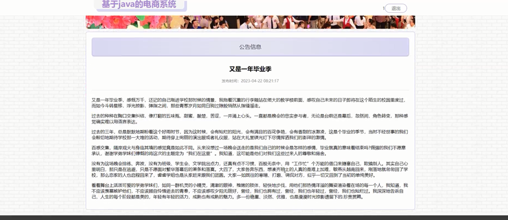 公告信息管理:发布系统公告,包括标题、简介、图片、内容等。