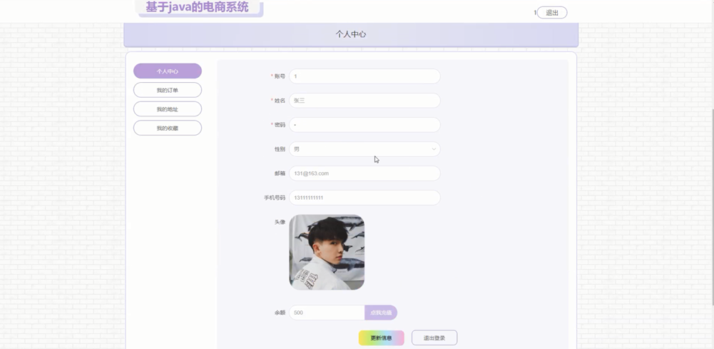 个人中心:用户可查看和修改个人资料,如账号、姓名、性别、邮箱、手机号码、头像、余额等,支持我的订单、我的地址、我的收藏管理。