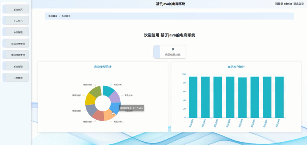管理员进入主页面,主要功能包括对个人中心、会员管理、商品分类管理、商品信息管理、系统管理、订单管理等进行操作。管理员主界面如图5-7所示:
