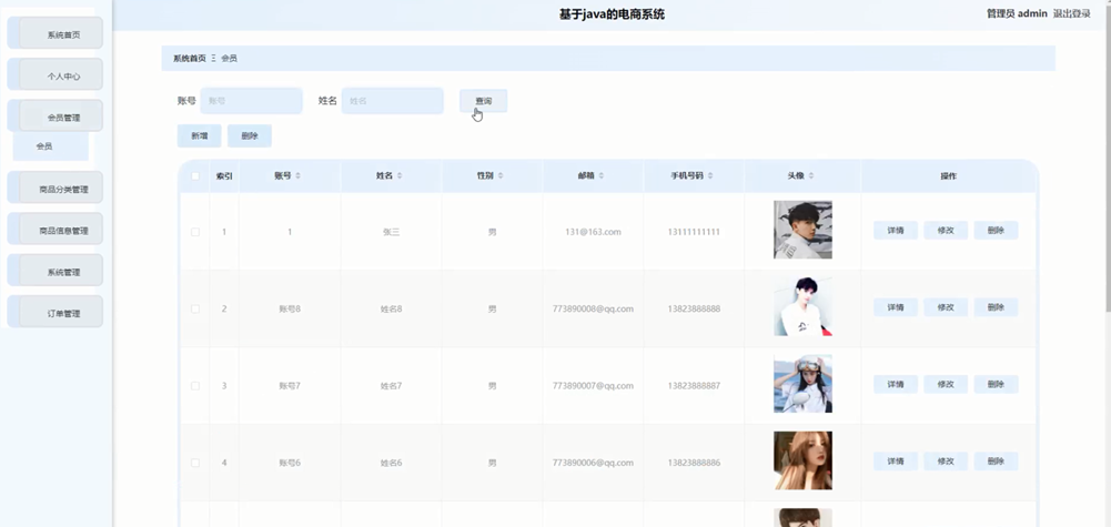 管理员点击会员管理。在会员页面输入账号和姓名进行查询、新增或删除会员列表,并根据需要对会员详情信息进行详情、修改或删除操作;如图5-8所示: