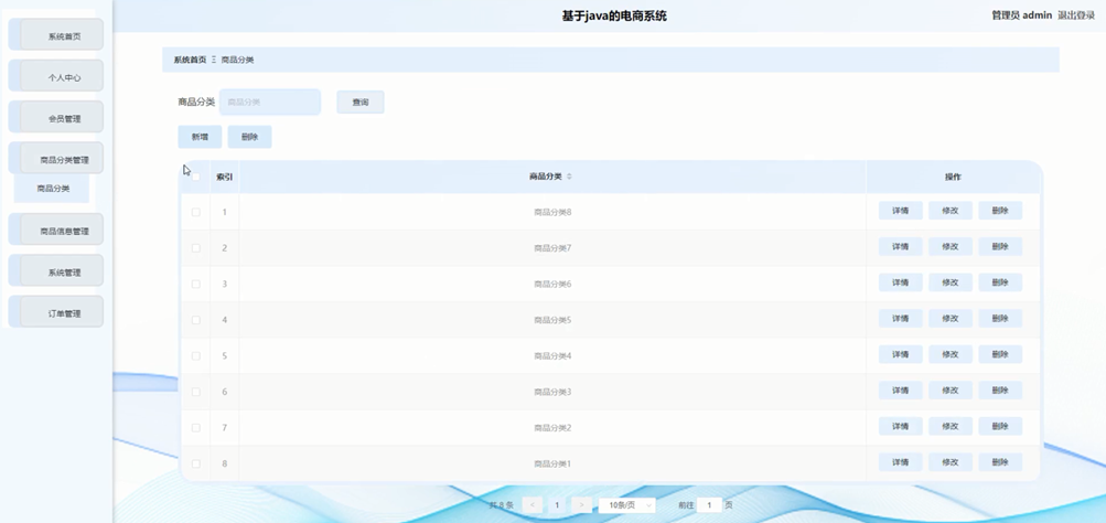 管理员点击商品分类管理。在商品分类页面输入商品分类进行查询、新增或删除商品分类列表,并根据需要对商品分类详细信息进行详情、修改或删除操作。如图5-9所示: